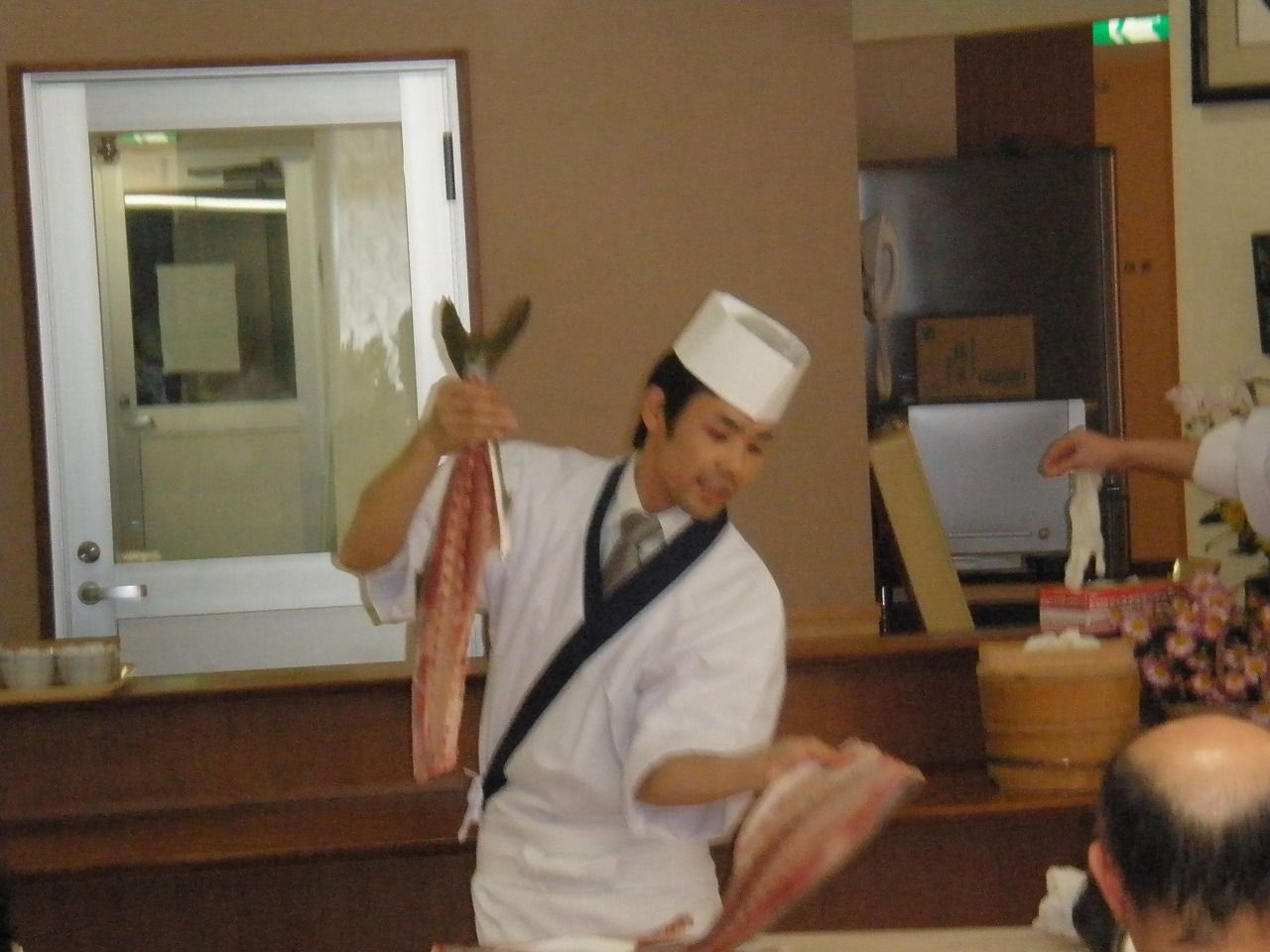 魚の解体ショーが行われ、この日は出生魚のはまちをさばいていただきました。