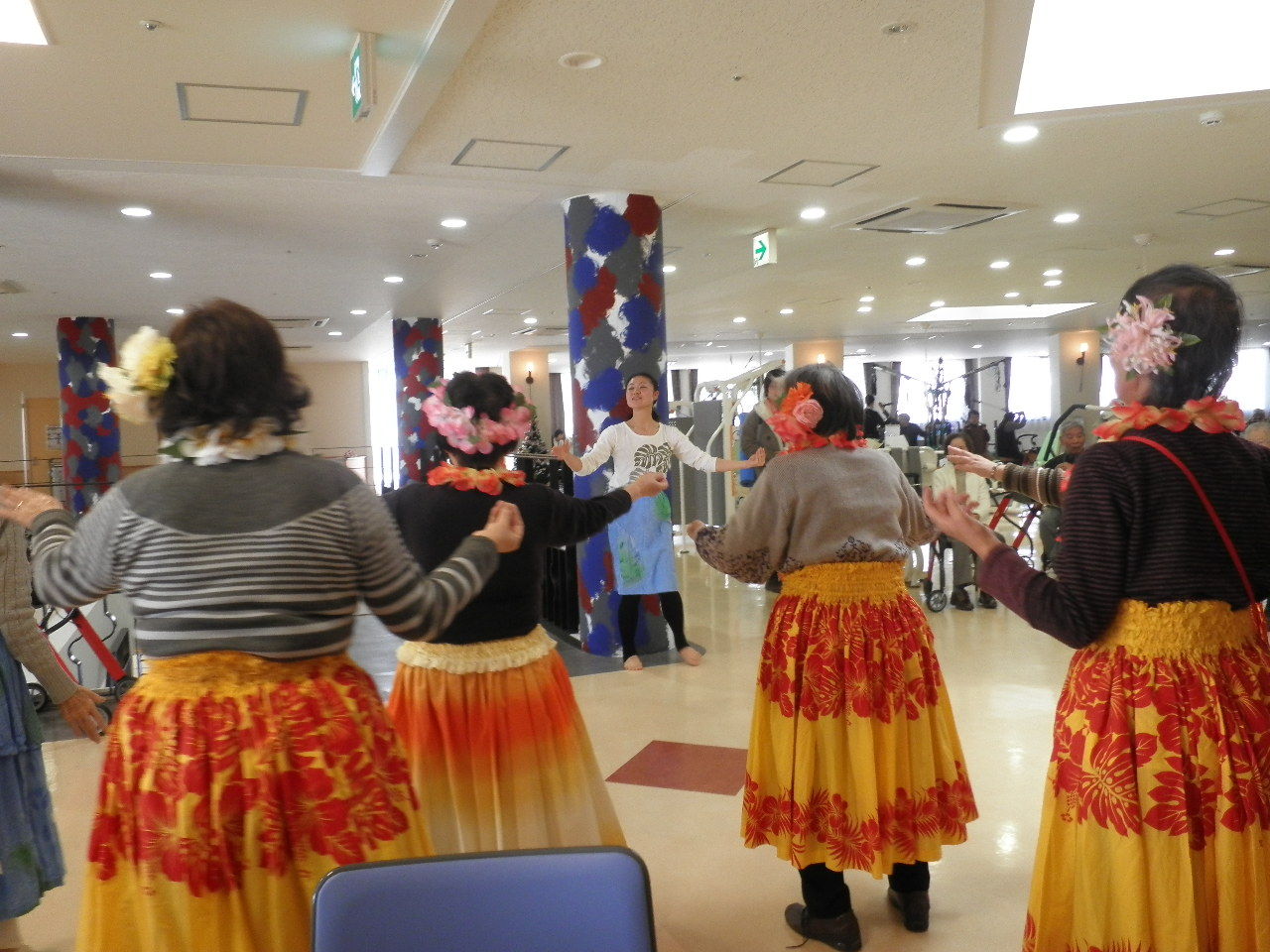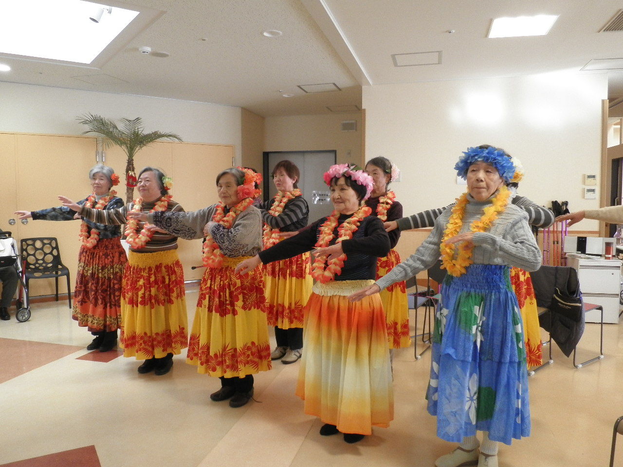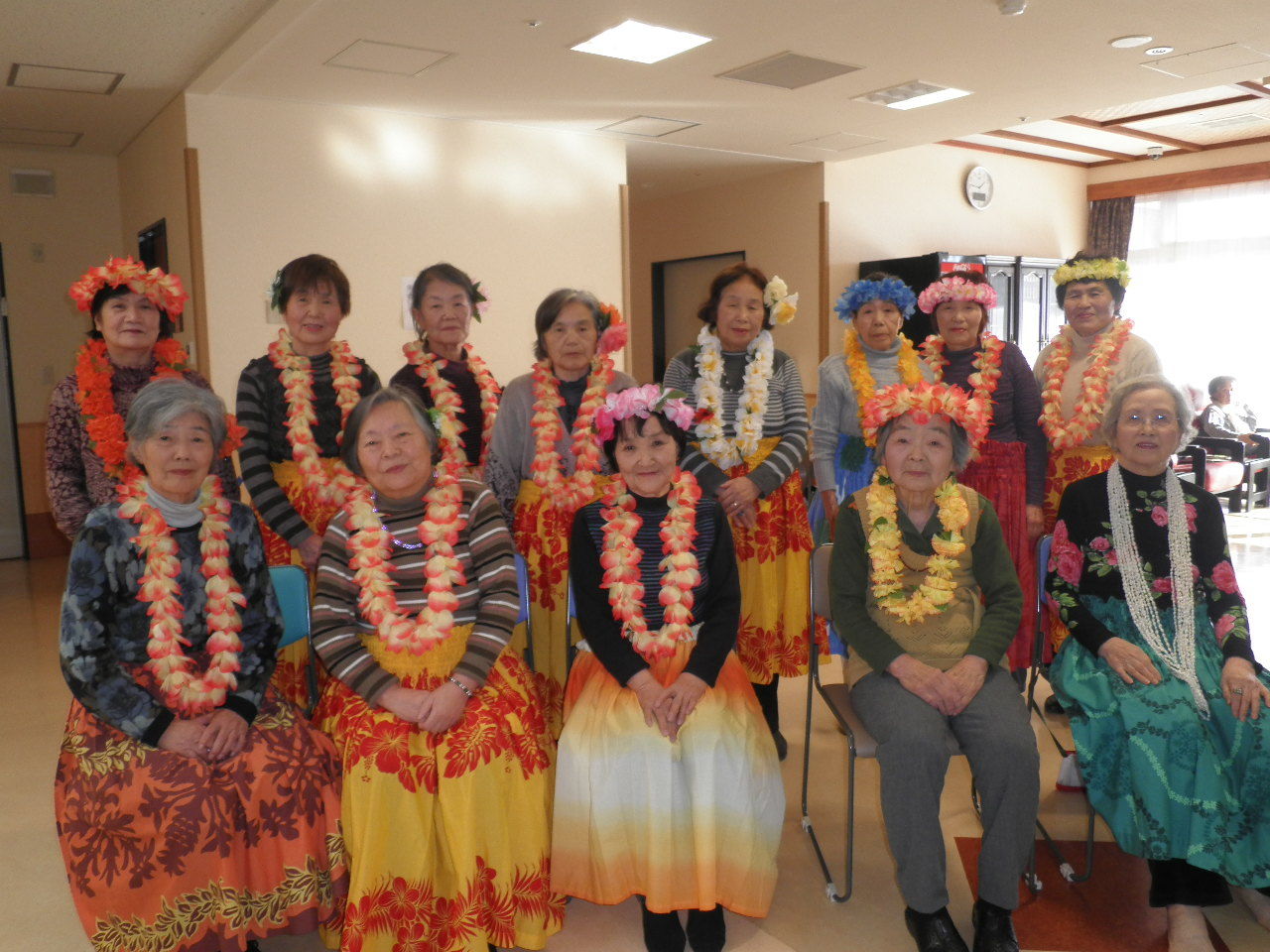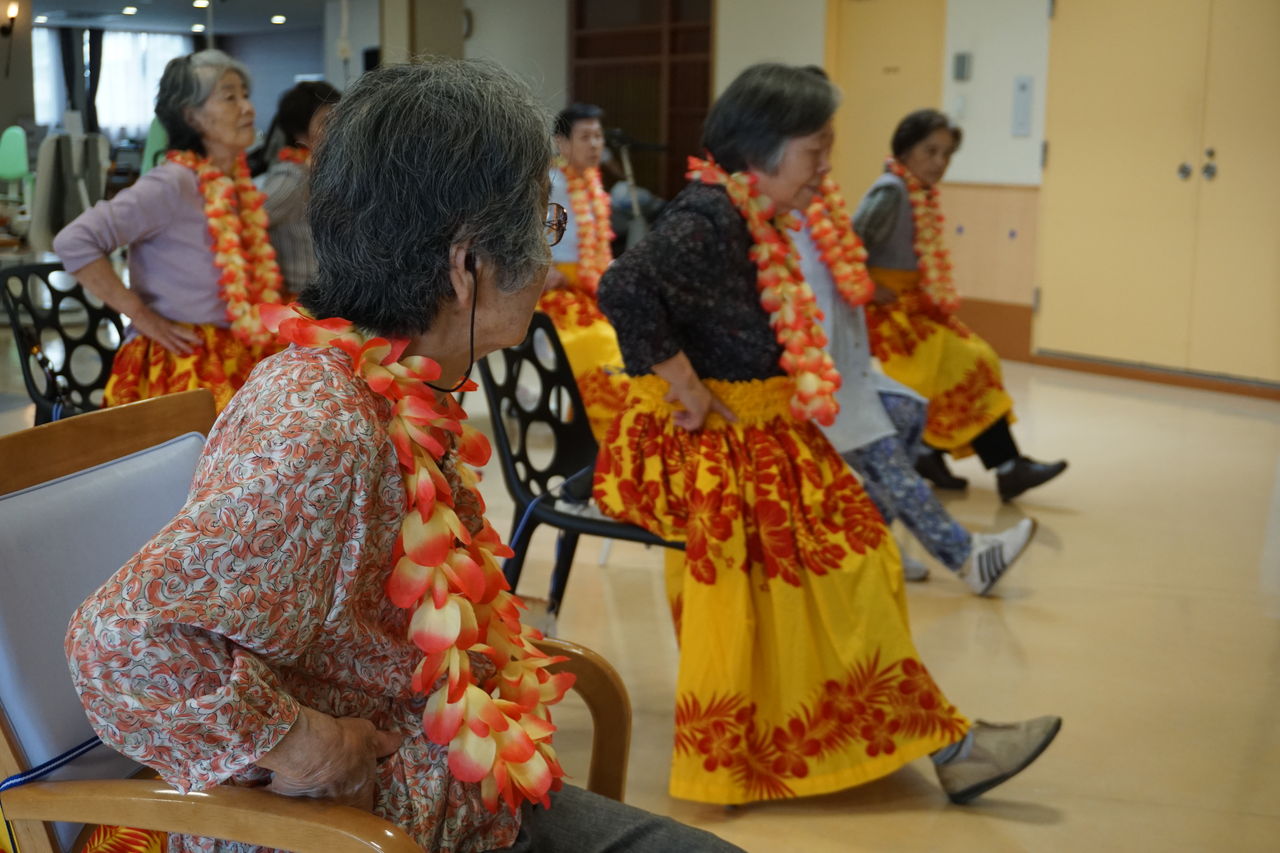 曲に合わせ多勢で踊るフラは美しく、観覧していた御利用者様やスタッフも皆、魅了されました。