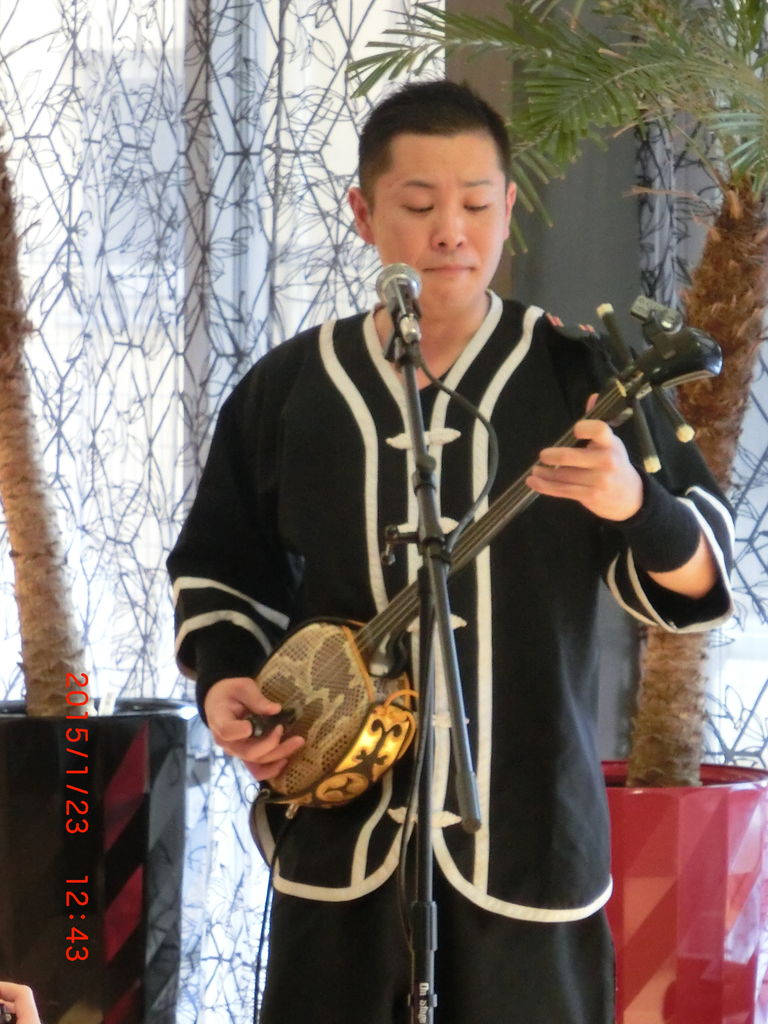 ランチタイムに木次顕彰様をお招きし、蛇味線ライブを開催致しました。