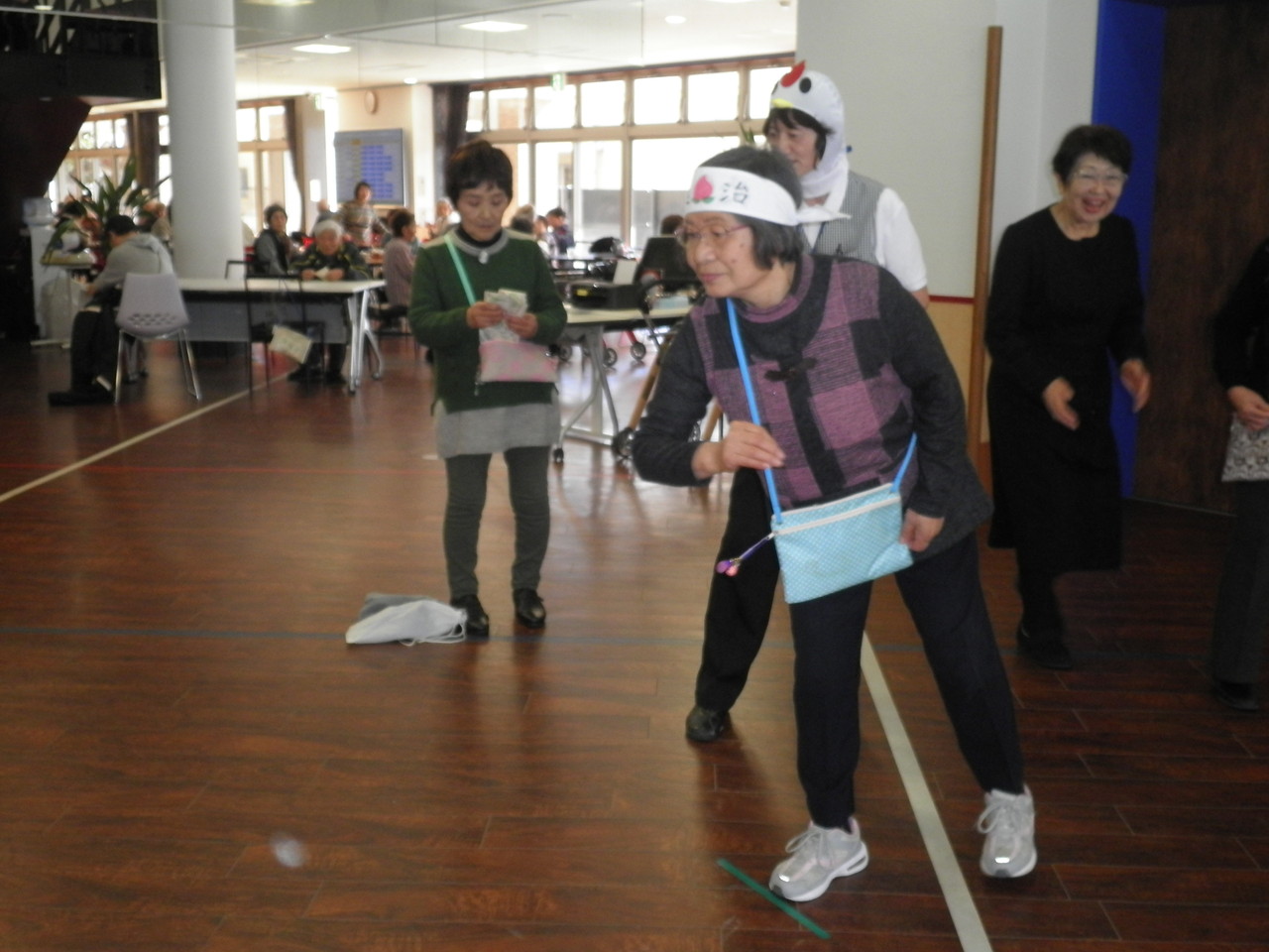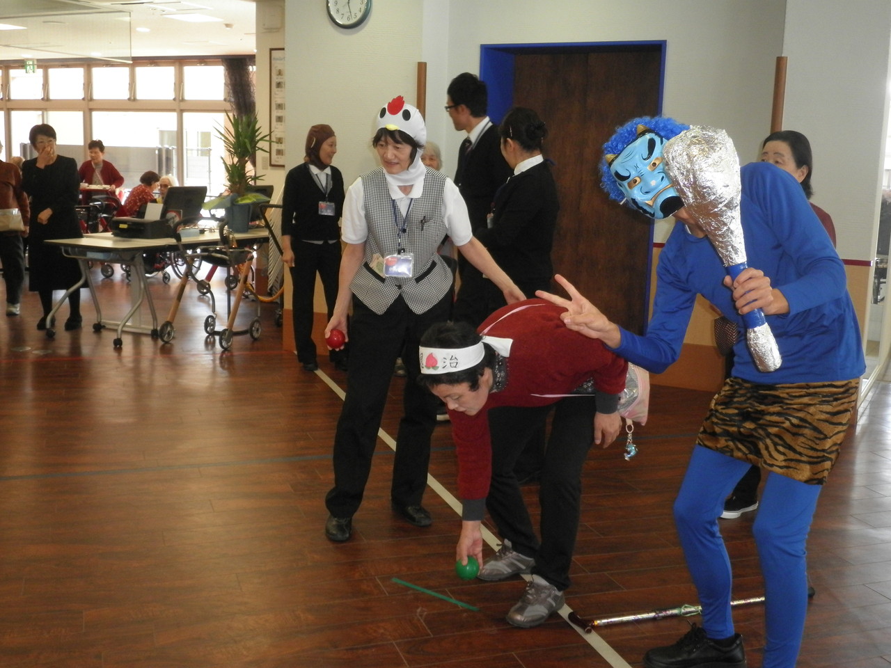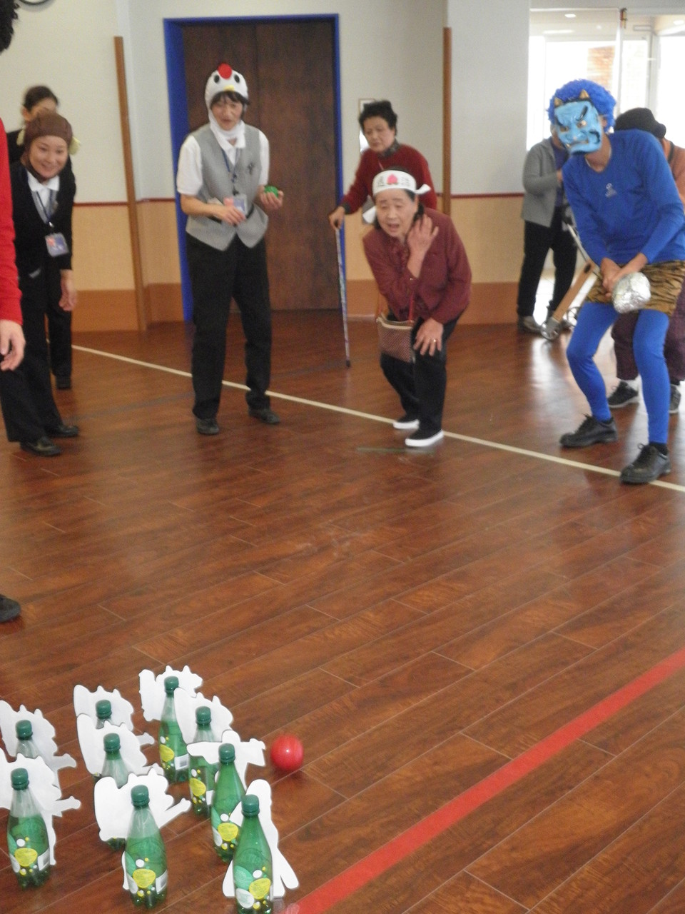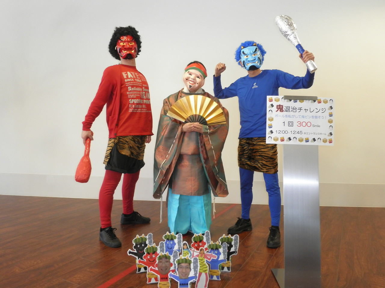 今年の節分イベントは、投てき者に桃太郎になって頂き、イヌ・サル・ニワトリ?の子分を連れて、鬼に見立てたボーリングのピンを倒して頂くといったイベントを開催しました。