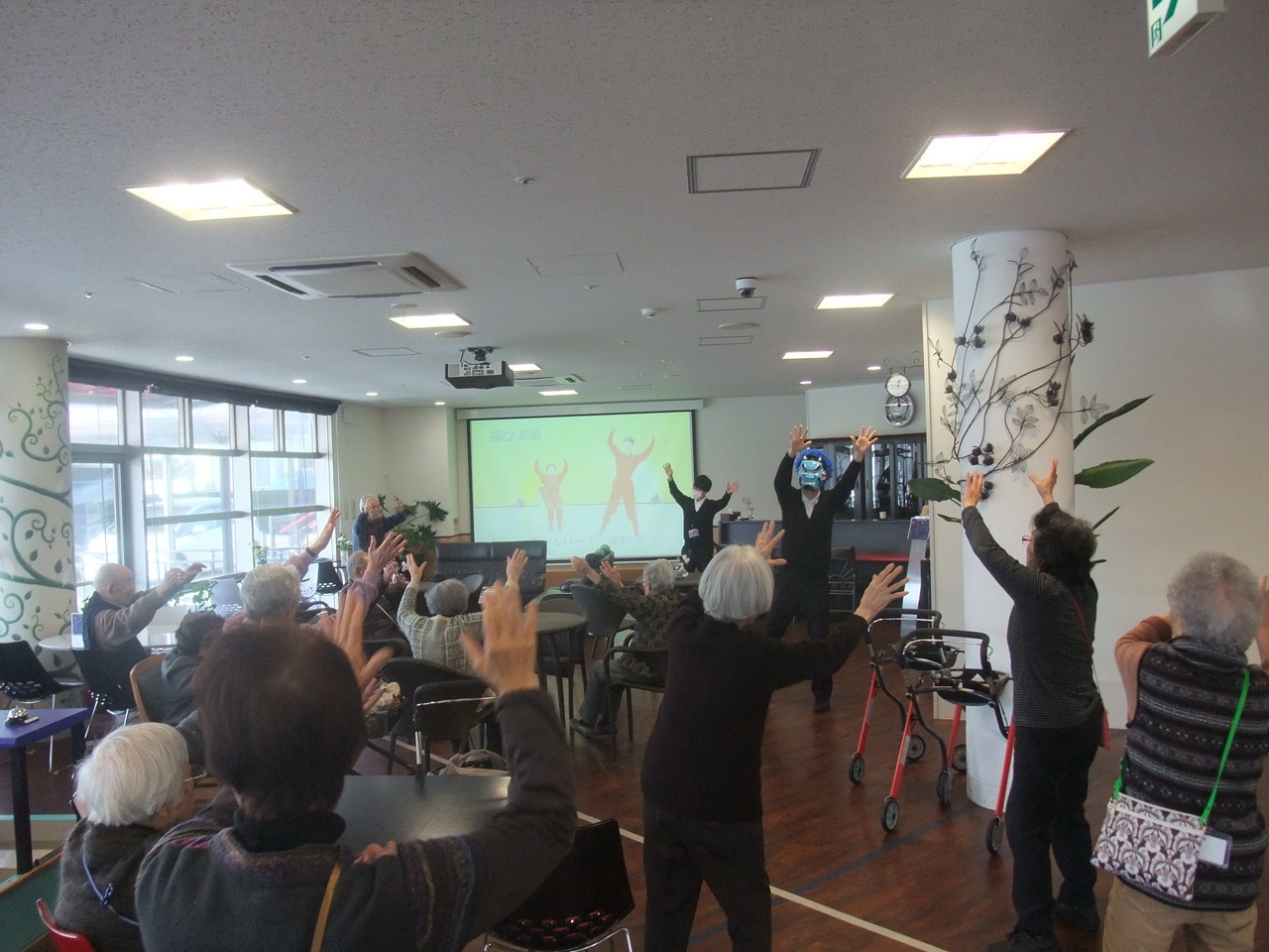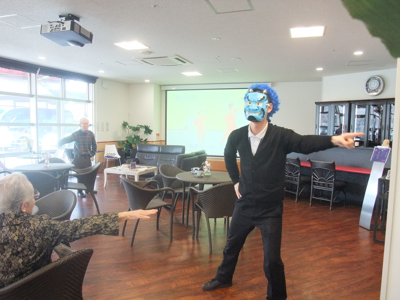 ランチタイムの最後は毎日開催している「忍にん体操」を鬼が前に出て「鬼んにん体操」と称して体操しました。