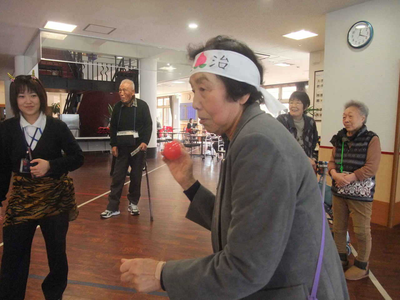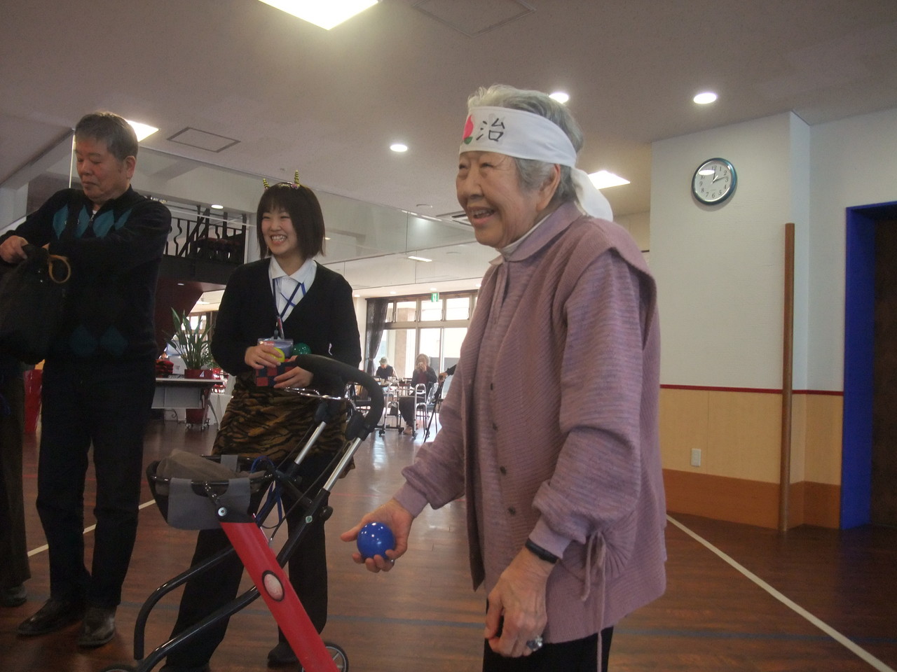 鬼に見立てたピンをボールを投げて倒す鬼退治です。