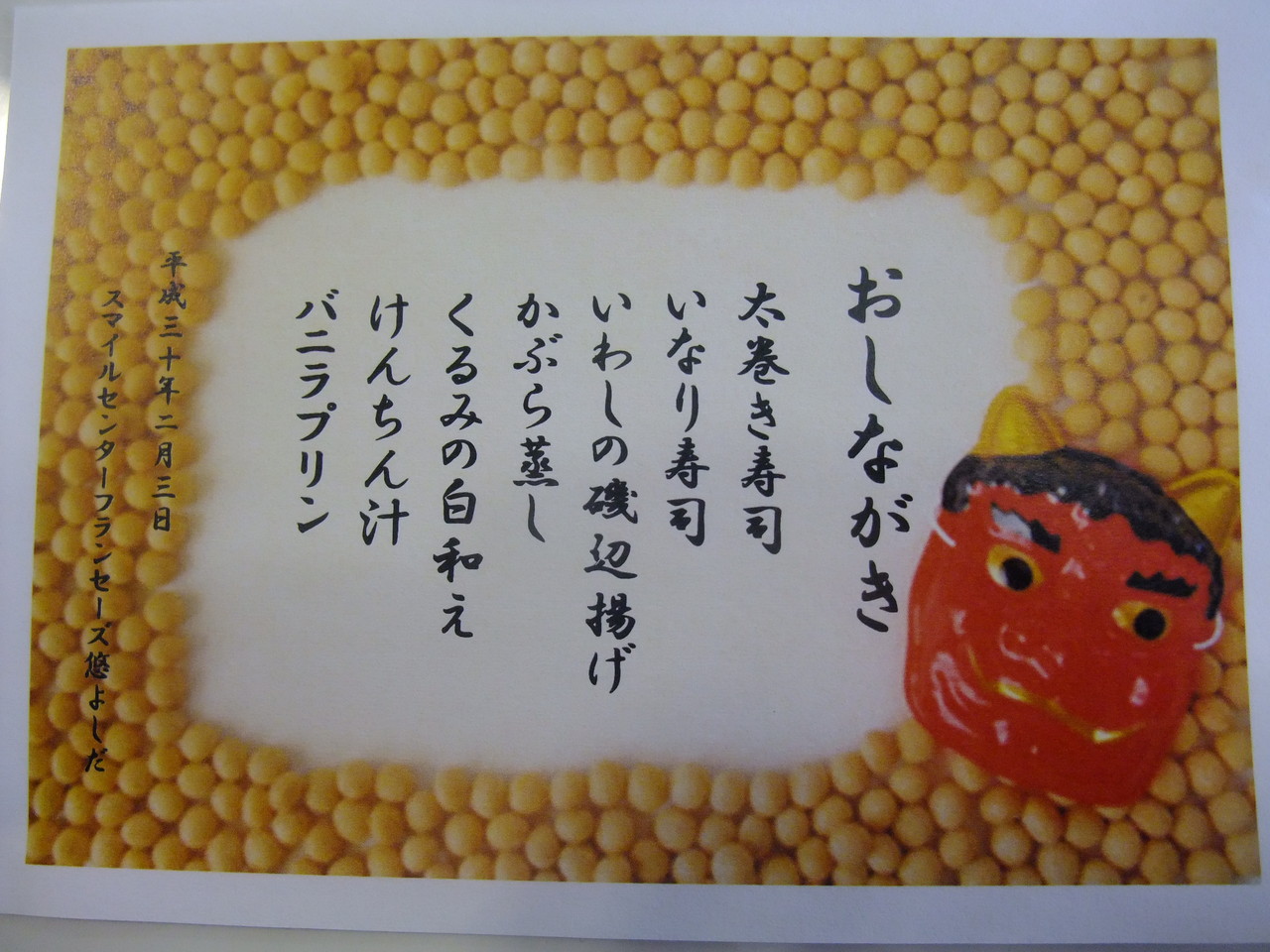 節分に食べる縁起物の「いわし」「こんにゃく」「けんちん汁」がメニューに並びました。